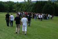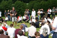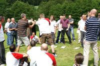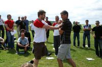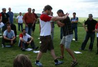 3.6.2009 Wichtige Aufgaben eines Kugelschreibers Beim zweiten Teil des Leadership-II-Seminars am Pfingstwochenende brachte Escrima-Meister Thomas Dietrich aus Seesen den anwesenden 150 EWTO-Schulleitern diese Sparte durch Kugelschreibereinsatz näher. Wer gedacht hatte, ein Escrima-Meister könne nur mit Waffen umgehen, der musste sich an diesem Wochenende eines besseren belehren lassen. Sifu Thomas Dietrich zeigte sich ebenso wortgewandt und verstand es, seine Zuhörer mit seinem Vortrag über die EWTO-Sparte Escrima und dem zugehörigen Praxisteil in seinen Bann zu ziehen. Er nutzte das gute Pfingstwetter, um den Unterricht nach ein paar einleitenden Worten auf die die Manfred-Sauer-Stiftung umgebende Wiese zu verlagern. Die Seminarteilnehmer folgten ihm mit ihren Skripten inkl. Aktenhülle und Kugelschreiber bewaffnet nach draußen.Zunächst gab es einigen theoretischen Input zu den Begriffen Escrima, Kali und Arnis. Die Kugelschreiber waren gefordert, die Ergänzungen zu notieren. Es folgte eine Vorübung zum Praxisteil mit dem Thema Alltagsgegenstände als Waffe zur Selbstverteidigung nutzen. Die Unterlagen und Schreibwerkzeuge wurden dazu aus der Hand gelegt. Die Kugelschreiber waren jedoch nicht arbeitslos: Sie hatten jetzt quasi als Klemmen bzw. Briefbeschwerer zu verhindern, dass die Blätter durch den teils recht böigen Wind aus den Hüllen geweht wurden. Die Seminarteilnehmer konnten unbesorgt die ihnen aufgetragene erste Übung durchführen: Einer stand mit hängenden Armen da und wurde durch seinen Trainingspartner der mit ausgestreckten Armen auf ihn zukam weggeschoben.
